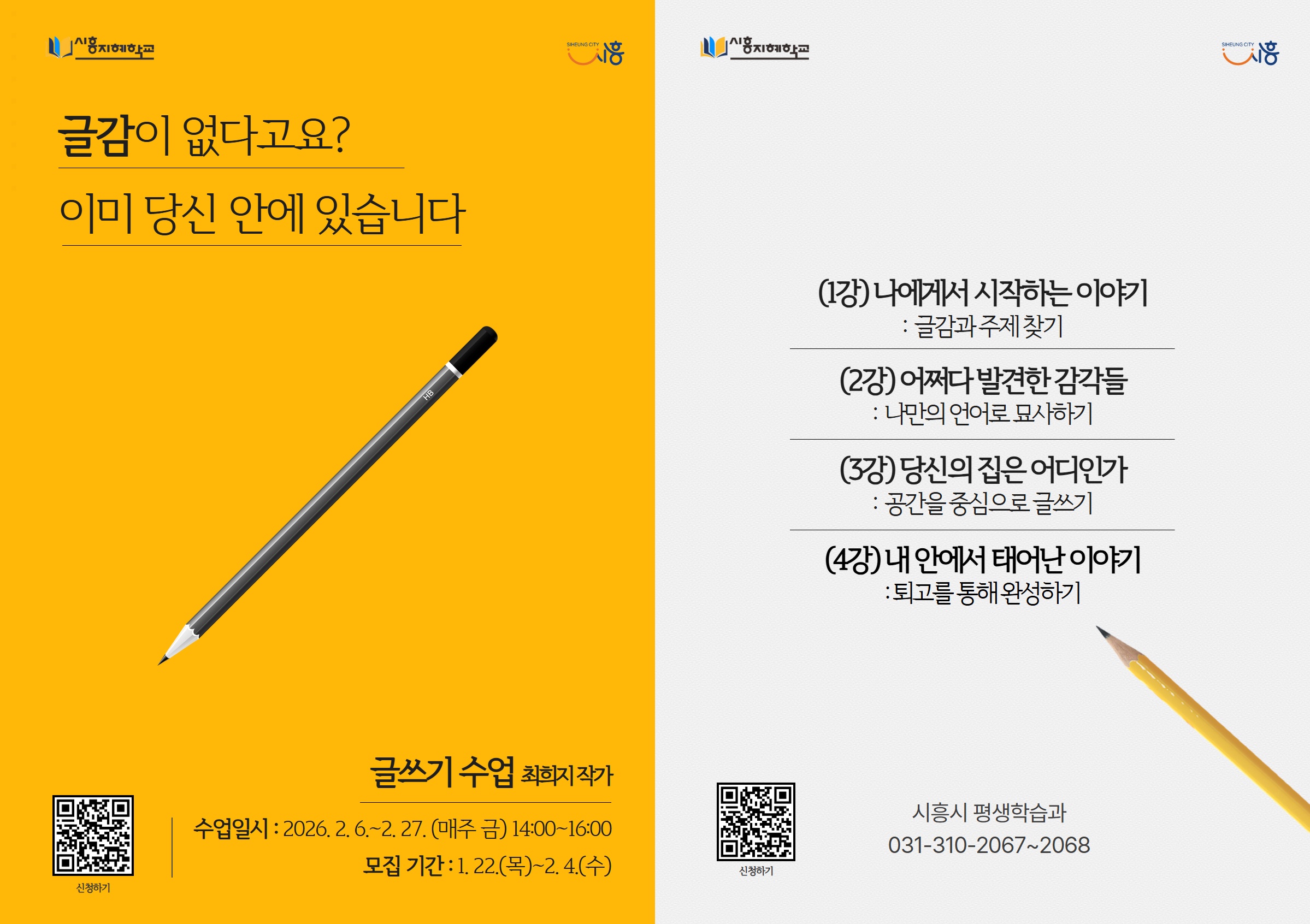 [2026 시흥지혜학교] 글감이 없다고요? 이미 당신 안에 있습니다 (글쓰기) * 총 4회차 - 강사명 : 최희지 작가 - 세부내용 : 창의적인 글쓰기 방법을 배우고, 글을 통해 "나"를 표현하기. *세부 커리큘럼 필히 확인 - 교육방식 : 이론 및 실습