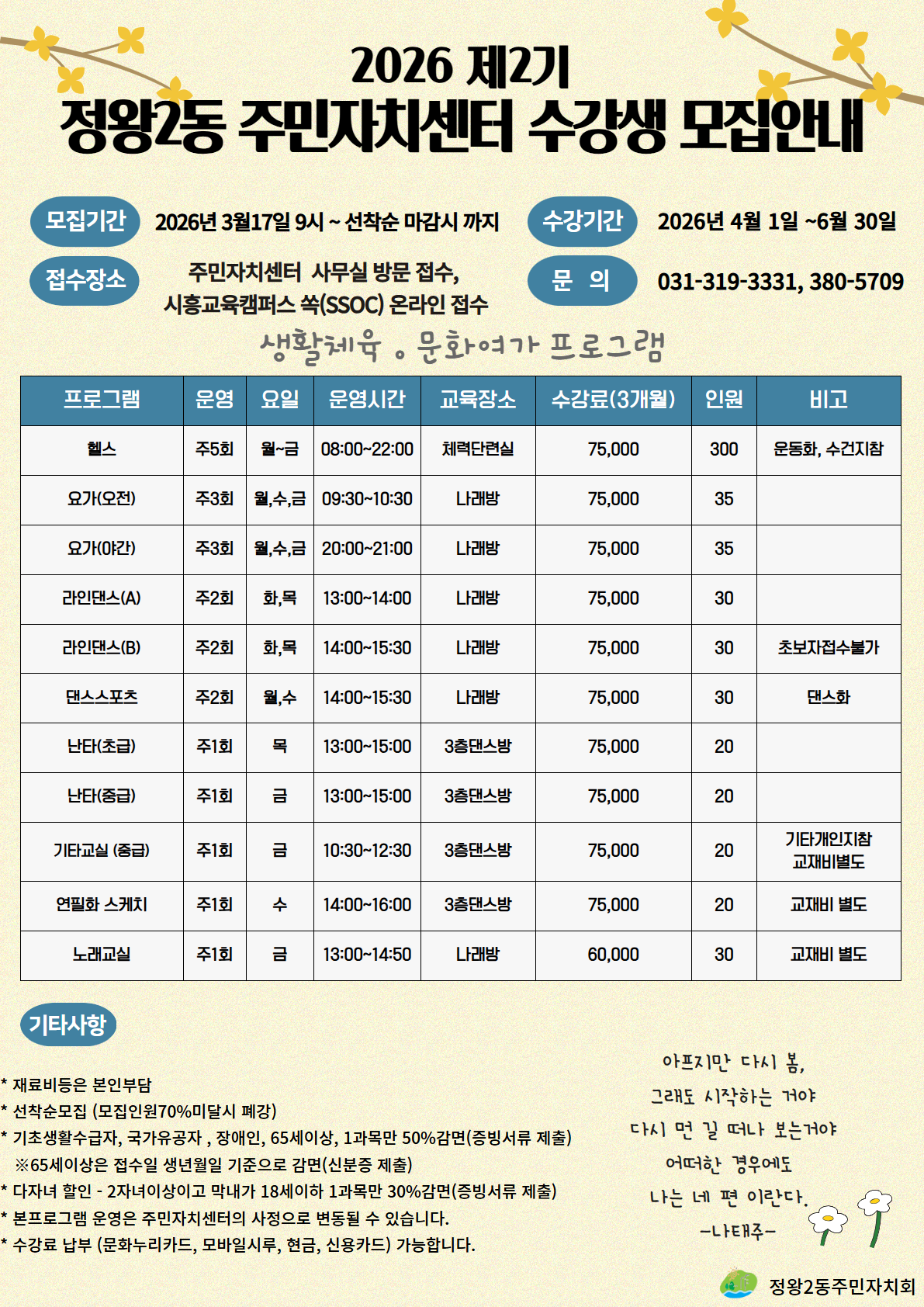| 수강관련 문의처 | 정왕2동 주민자치센터 / 031-319-3331 / jw2dong@naver.com |