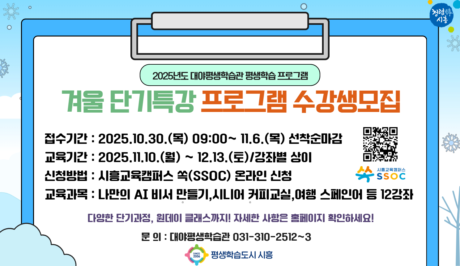 ▣ 2025년 대야평생학습관 겨울 단기특강 프로그램 수강생 모집 안내